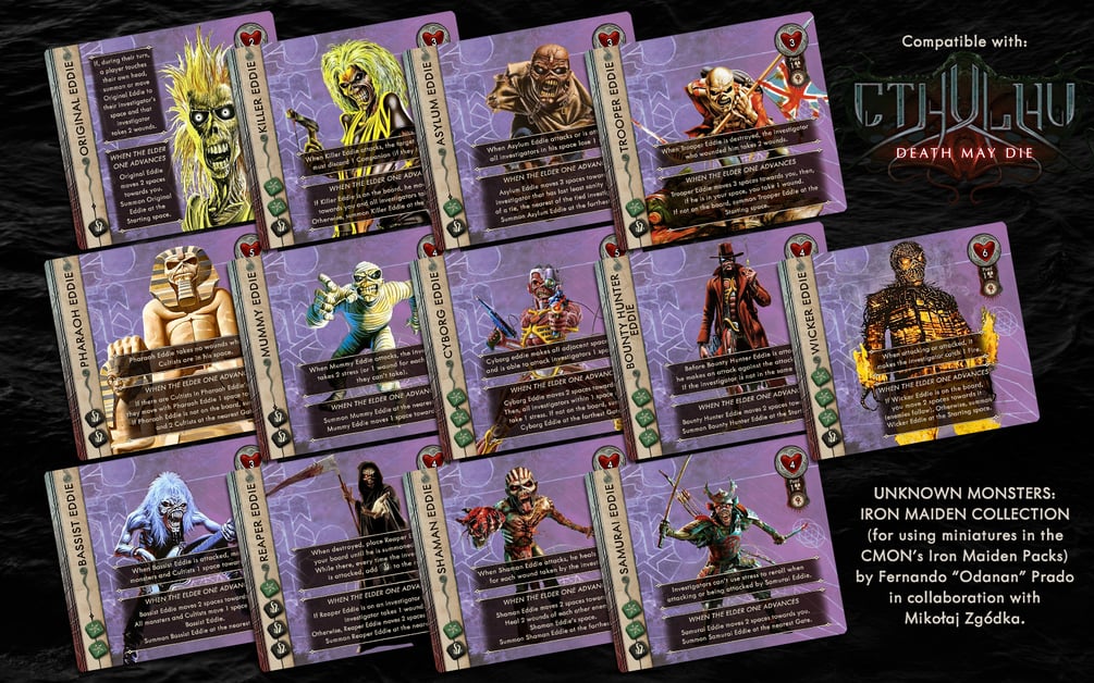 Cthulhu Death May Die Unknown Monster cards for all Iron Maiden miniatures.
