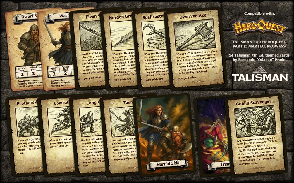Martial Prowess brings steel and skill to your HeroQuest adventures! This mini-expansion introduces 2 battle-hardened heroes — the bold Warrior and the steadfast Dwarf Soldier — along with 6 Martial Skills, a trove of new weapons and armor (including 4 "mastercraft" weapons), and a surprising Treasure card. Add brute strength, tactical flair, and unshakable courage to your next quest!